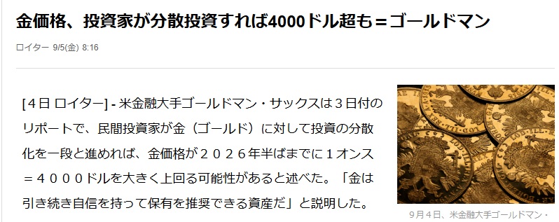 ゴールドが上昇する要因としては、FRBによる利下げが見込まれており、米金利低下では米国債のうま味が減り、ゴールドへ資金が移る可能性が示唆されています。また、各国で戦争や紛争などの地政学的リスクも高まっているので、現物で安全資産であるゴールドの人気が高まっています。さらに、投資家がゴールドのメリットに気付き分散投資をすると、さらに上昇する余地があるとロイターは報じています。