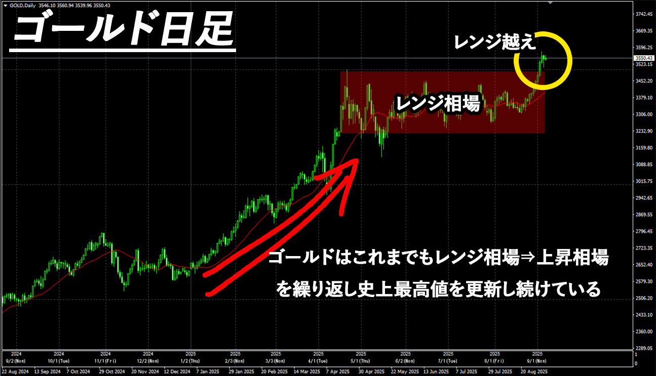 そして、なんといっても、ゴールドが上昇する可能性が出てきている理由は、レンジ相場の上限をブレイクしてきたからです。これまでも上昇したのち、レンジ相場となり、再び上昇する、を繰り返して過去最高値を更新し続けているので、今回も同様のパターンになる可能性があります。こういうのは初動を捉えることができれば、一番おいしいので見逃さないようにしたいですね。
