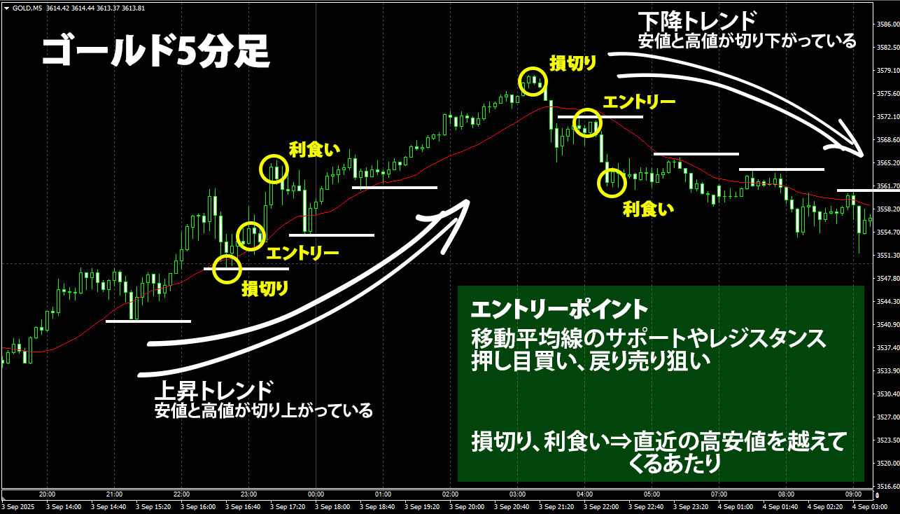具体的なトレード方法ですが、これはトレンドフォロー型の手法が良いです。やはり、大きなトレンドが付きやすいゴールドですので、流れに沿ってやっていくことが良いでしょう。ということで、移動平均線1本だけでも十分にやっていけますし、むしろ、これが最良のやり方だと思います。